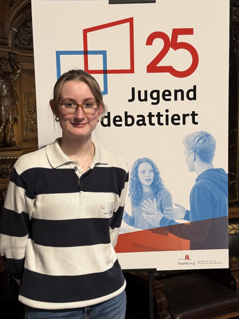 Bereits zum wiederholten Male gelang es einer Schülerin der Stadtteilschule Oldenfelde am Landeswettbewerb von „Jugend debattiert“ am 27.03.2026 im Hamburger Rathaus teilzunehmen. Lilly G. aus dem 11. Jahrgang stritt mit Jugendlichen anderer Schulen aus der Hansestadt mit viel Engagement über so kontroverse Themen wie „Sollen arbeitende Strafgefangene den gesetzlichen Mindestlohn erhalten?“ oder „Soll für Mandatszeiten der Abgeordneten der Hamburgischen Bürgerschaft eine Höchstgrenze gelten?“